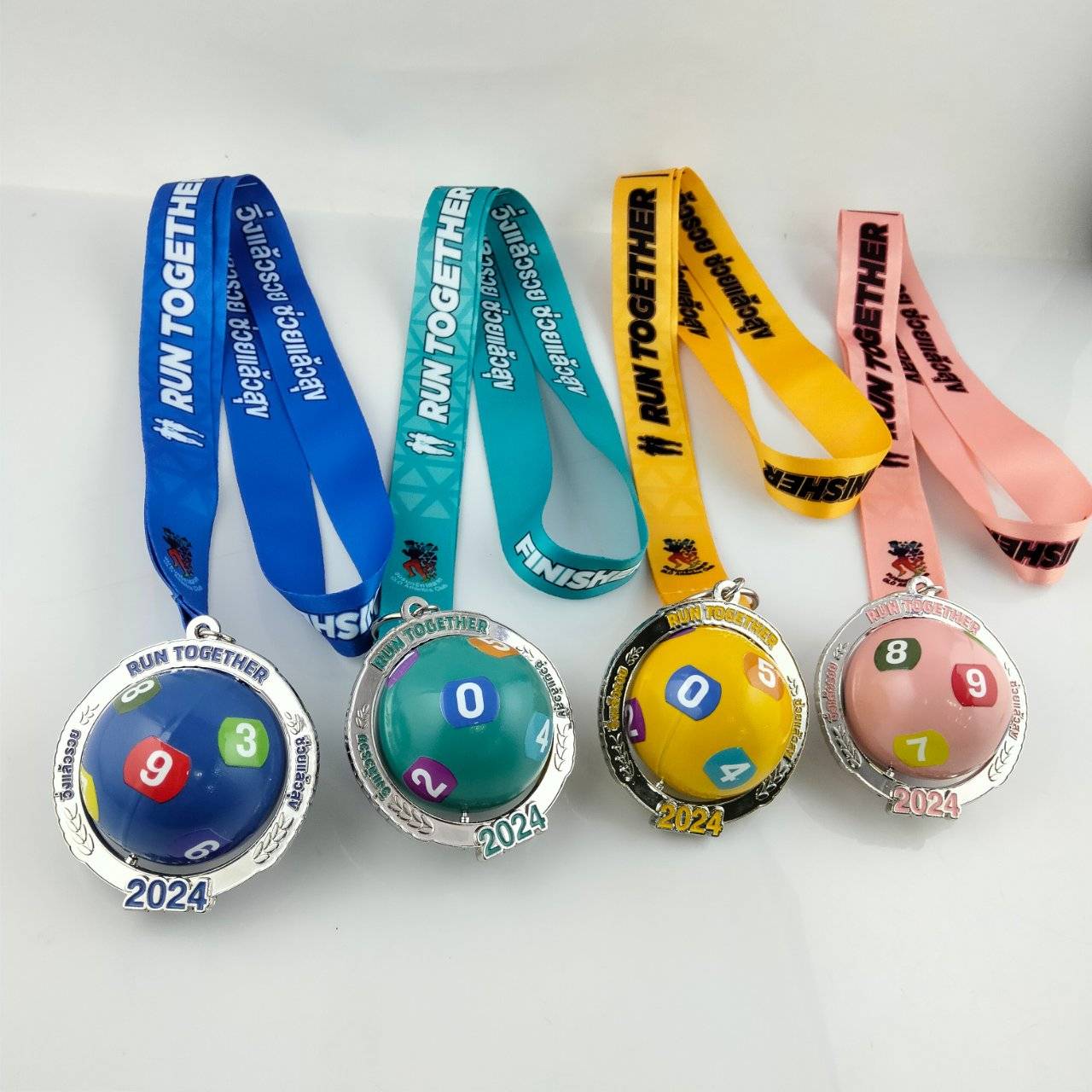 วัสดุของเหรียญเป็นโลหะครึ่งวงกลมสองชิ้นนำมาประกบเข้าหากันและต้องเชื่อมเข้าด้วยกันเป็นเรื่องที่ยากมากที่จะไม่ให้มีรอยต่อ การออกแบบแกนเหล็กติดตั้งต้องพอดีที่สามารถสอดเสียบเหรียญทรงบอลวงกลมนี้ลงไปถ้ายาวไปก็เสียบไม่ลง จากนั้นนำลูกบอลนำไปชุบสีตามแบบสีที่ลูกค้าต้องการ หลังการชุบสีต้องรอให้แห้งสนิทแล้วจึงนำไปสกรีนตัวเลข ก่อนสกรีนนั้นผลิตและผมได้หาวิธีการมากมาย แต่หาเครื่องทำไม่ได้ ตอนนี้เริ่มเครียดกันมากๆ และลูกค้าเริ่มสอบถามงานเข้ามาเนื่องจากผ่านไปเกือบ 1 เดือน (20กว่าวัน) ทางเราได้จัดส่งคลิปแบบที่ยังไม่ได้สกรีนให้ลูกได้ดูก่อน เป็นการประกบงานลูกบอลสีและหมุนได้ให้ดูก่อน จนเราได้พบวิธีการที่พอจัดทำได้คือ การสกรีนแบบ UV DTF เป็นเทคโลโนยีสกรีนบนแผ่นฟิล์ม ที่ติดแล้วไม่เห็นขอบสติ๊กเกอร์ใดๆ แต่ต้องติดด้วยมือ 100% ช่วงแรกการติดเกิดปัญหาเรื่องความตรงของและเว้นขอบพื้นที่มากไป ลูกค้าต้องการให้ทางเราปรับให้ติดให้เฉลี่ยงานเท่าๆ กัน และได้งานตัวอย่างออกมาทั้งหมด 4 สี พร้อมริบบิ้นสีเทา จัดส่งงานตัวอย่างที่ลูกค้าต้องการ (ใช้เวลากว่า 2เดือนเต็มๆ ) หลังจากลูกค้าได้ตัวอย่าง ได้ปรับเรื่องริบบิ้นไม่เด่นมาก ทางเราเลยแนะนำให้ปรับเป็นสีตามลูกบอล เราทดลองทำริบบิ้นสีให้ลูกค้าดู ลูกดูแล้วชอบเราจึงปรับแบบใหม่ สีที่ลูกบอลต้องลงสีให้หนาไม่เห็นรอยต่อ อีกเรื่องตัวเลขต้องปรับให้ใหญ่เพื่อให้พื้นที่ของสีบอลน้อยลงให้ตัวเลขเด่นมากขึ้น
