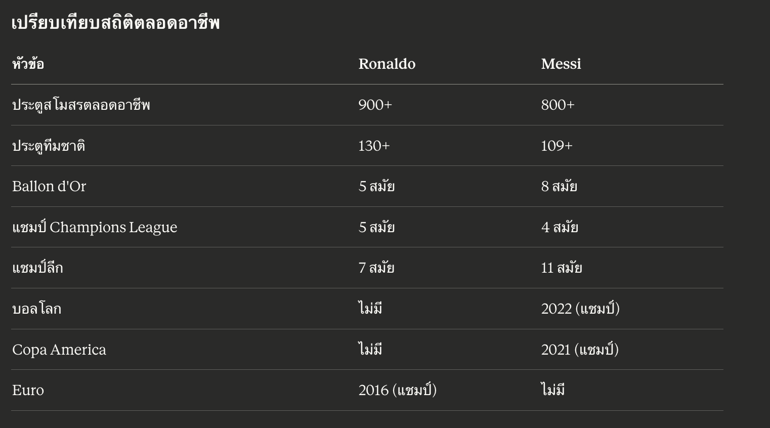 ถ้าคุณเชื่อว่า ความสำเร็จระดับชาติสำคัญที่สุด Messi ชนะ เพราะเขาพาอาร์เจนตินาชนะทั้งบอลโลกและ Copa America สิ่งที่ Ronaldo ไม่เคยทำได้