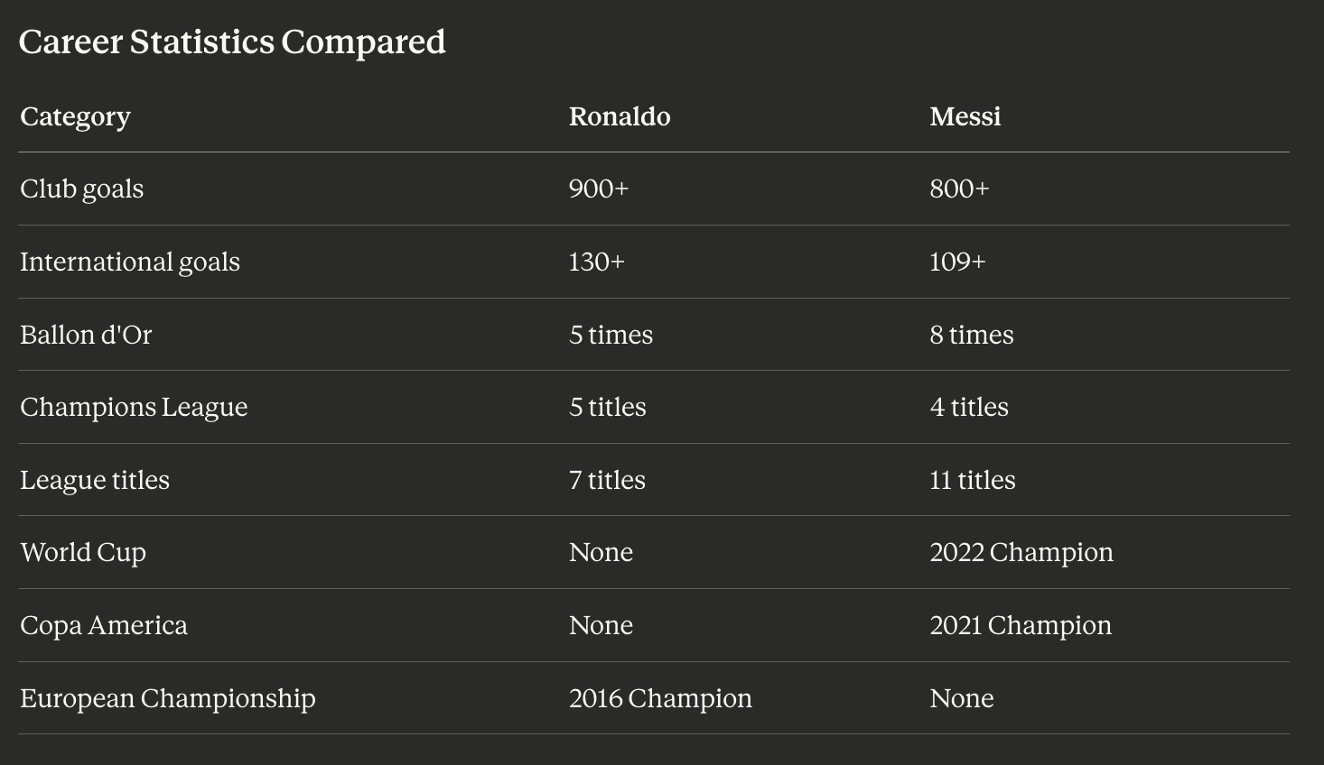If you believe international success is the ultimate measure, Messi wins. He delivered the World Cup and Copa America to Argentina — achievements Ronaldo never reached with Portugal.